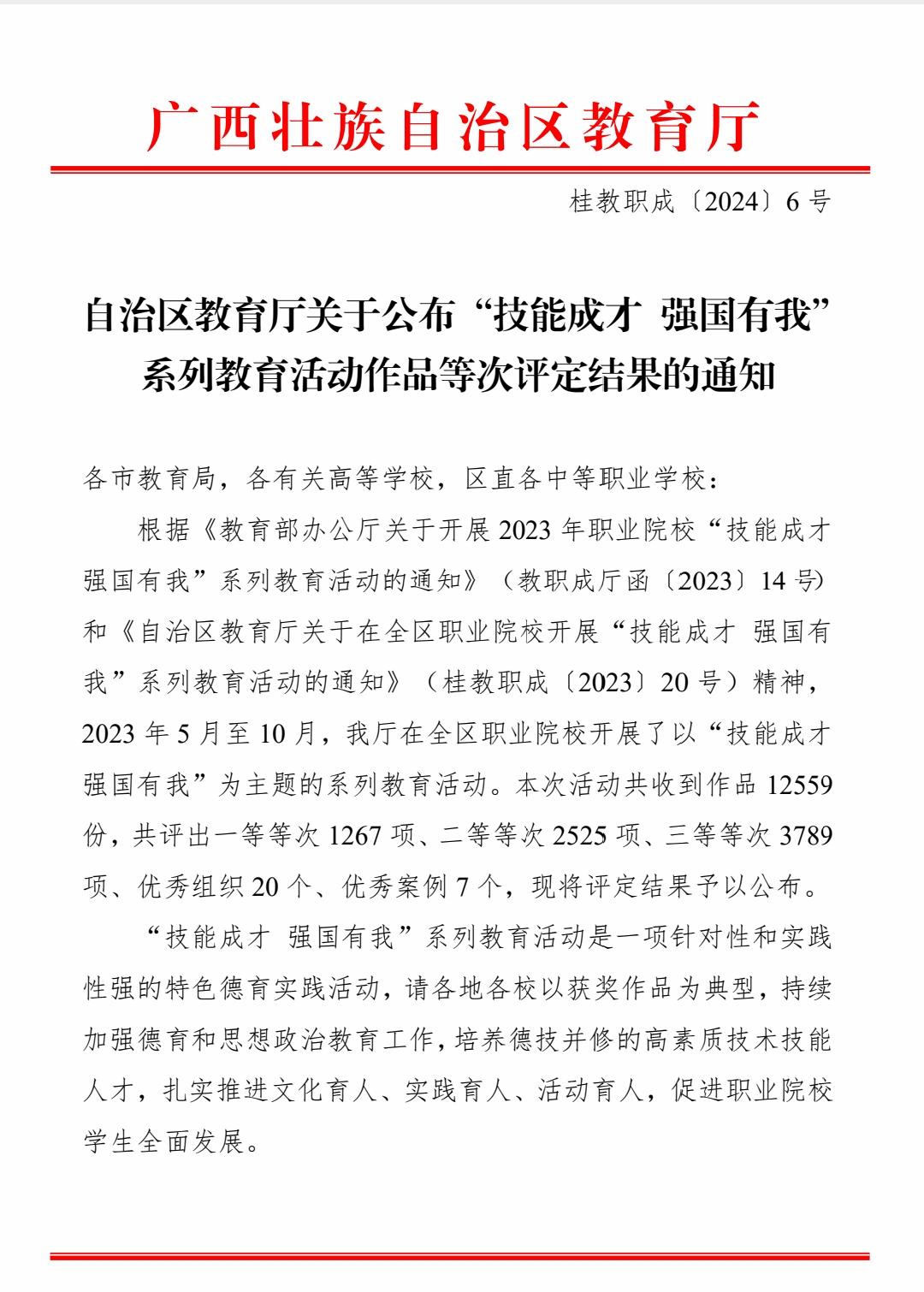 广西建院2月23日讯(党委学生工作部 田申)近日,根据《自治区教育厅关于公布“技能成才 强国有我”系列教育活动作品等次评定结果的通知》(桂教职成[2024]6号),sports获奖12项,其中一等奖1项、二等奖6项、三等奖4项,典型案例荣获三等奖。文件通知sports高度重视本次“技能成才 强国有我”系列教育活动。活动期间,sports针对学生特点开展切合实际、生动有效、喜闻乐见的活动,坚持活动育人、实践育人、以文化人,实现“班班活动、人人参与”...