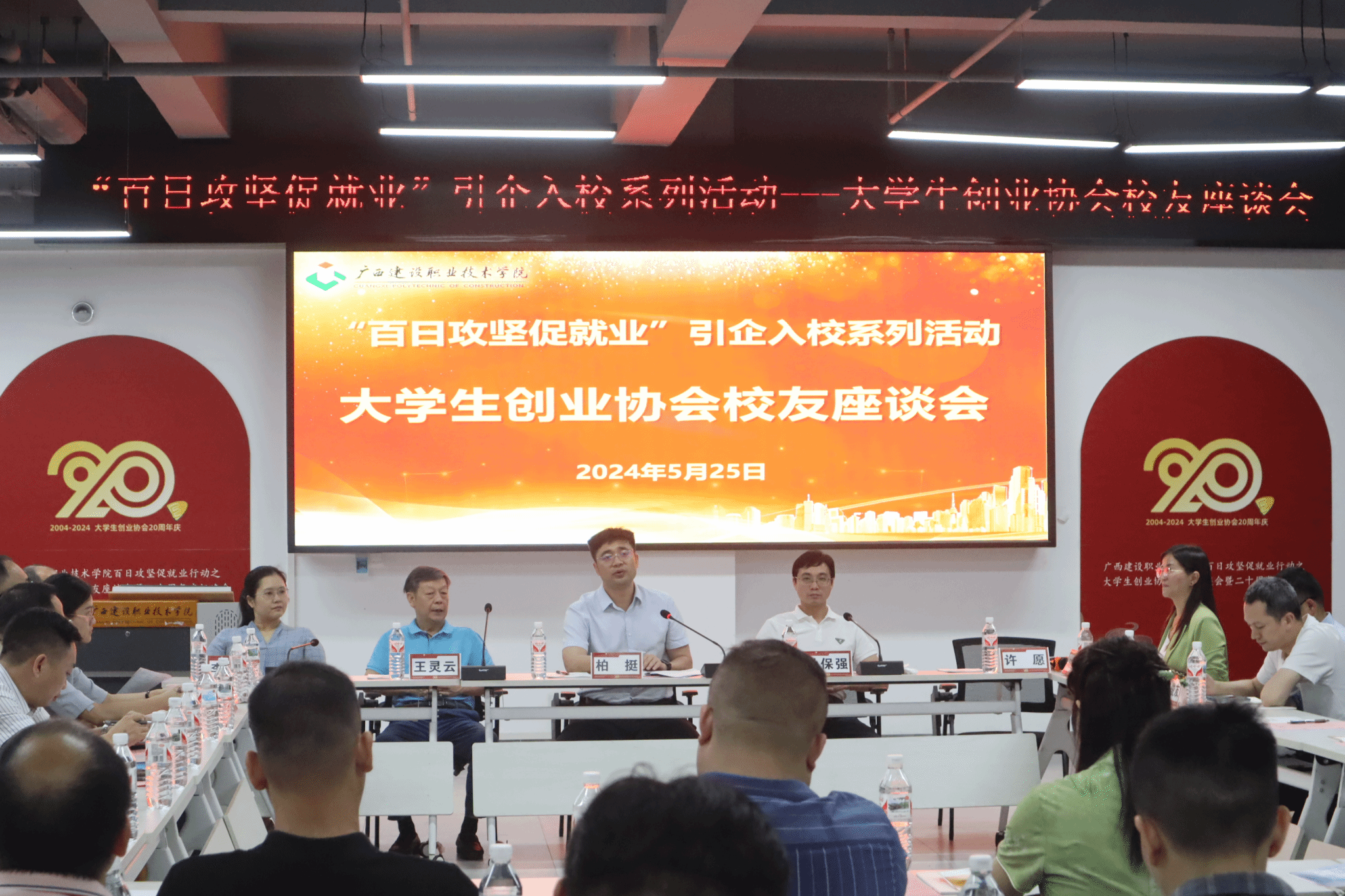广西建院5月27日讯(文/招生就业处 练翠滢 图/创业协会)为全面总结大学生创业协会的发展成绩和经验,促进和加强协会校友间、校友与母校间的联系,发挥校友在毕业生就业中的积极作用,5月25日,大学生创业协会举行校友座谈会暨20周年庆祝活动。学校副校长柏挺,校友办常务副主任王灵云、招生就业处副处长晏毅、历任及现任指导老师和返校协会校友代表,共计140余人参加校友座谈会,招生就业处处长孙保强主持会议。座谈会上,柏挺副校长从办学规模、...