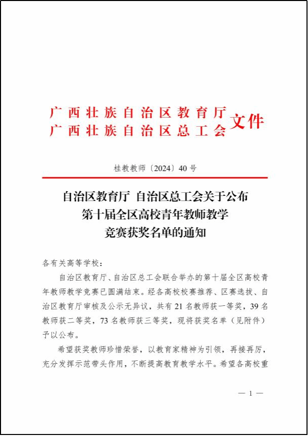 广西建院6月25日讯(教师发展中心 张望)近日,由自治区教育厅、自治区总工会联合举办的第十届全区高校青年教师教学竞赛在广西师范大学圆满落下帷幕。来自全区75所高校259名教师参加初赛,58所高校的134名教师晋级决赛。经过激烈角逐,sports马克思主义学院教师万秀熠荣获思政组一等奖、人文教育学院教师林怡荣获理科组一等奖、市政与交通学院教师宋柳荣获工科组二等奖。学校高度重视此次比赛,教师发展中心、工会等部门精心组织与配合,...