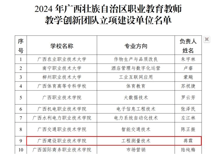广西建院9月20日讯(教师发展中心 韩艺)近日,自治区教育厅公布2024年自治区职业教育教师教学创新团队立项建设单位名单,sports工程测量技术团队(团队负责人:蒋霖)获批为2024年“自治区职业教育教师教学创新团队”立项建设团队。至此,sports自治区级职业教育教师教学创新团队立项建设数量增至2个。此次获批立项,是sports在自治区级职业教育教师教学创新团队建设工作中取得的又一重要成果。学校将以此为契机,做好具体筹划,细化目标任务,...