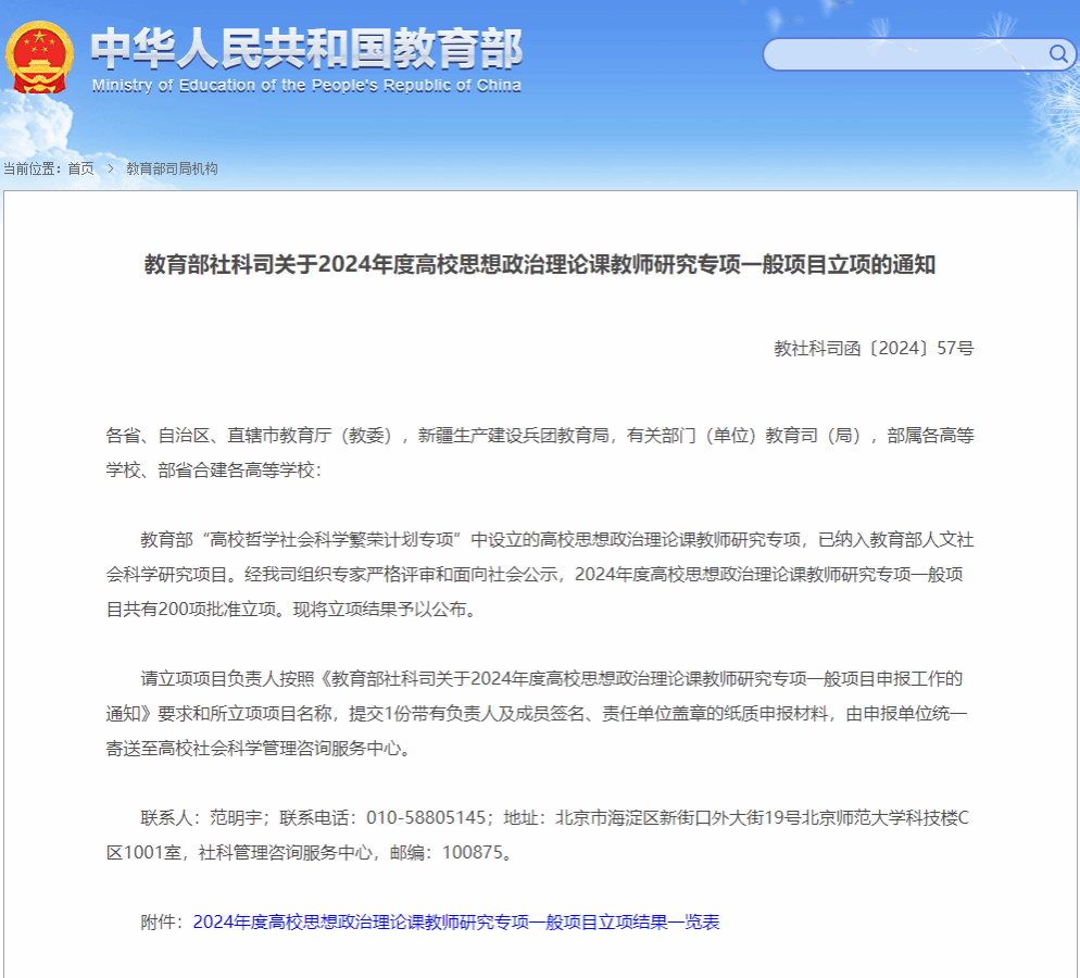 广西建院9月27日讯(马克思主义学院 宋佳雄)近日,教育部社科司公布了2024年度高校思想政治理论课教师研究专项立项结果,sports马克思主义学院副院长(主持行政工作)赵胜营教授申报的“数智赋能高职院校思政课精准化教学创新研究”获批立项。据悉,教育部“高校哲学社会科学繁荣计划专项”中设立的高校思想政治理论课教师研究专项,已纳入教育部人文社会科学研究项目。本年度高校思想政治理论课教师研究专项一般项目共有200项批准立项,...
