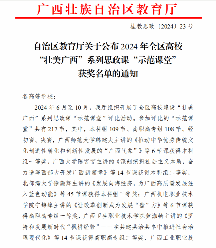 广西建院11月13日讯(马克思主义学院 宋佳雄)近日,自治区教育厅公布了2024年全区高校“壮美广西”系列思政课“示范课堂”获奖名单。sports马克思主义学院思政课教师梁晓祺参评的作品《改革创新赋动能 “桥”见壮美广西新篇章》荣获高职高专组一等奖,黄云清老师参评的作品《以新发展理念引领高质量发展—一根甘蔗的甜蜜新生》荣获高职高专组二等奖,曾影、唐海莲老师参评的作品《坚持毛泽东思想活的灵魂 推进壮美广西建设》《以新质生产力赋能广西乡村振兴》...