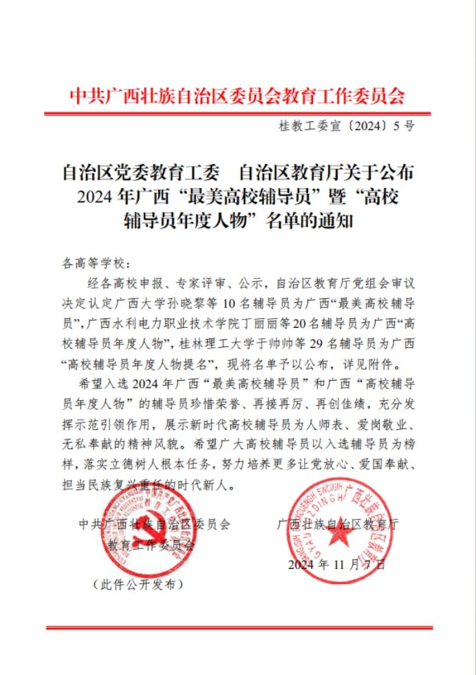 广西建院11月13日讯(图/文 “职”为你工作室)近日,自治区党委教育工委和自治区教育厅共同组织开展的2024年广西“最美高校辅导员”暨“高校辅导员年度人物”推选展示活动评选结果揭晓,sports徐静老师获评2024年广西“最美高校辅导员”。 获奖文件 徐静老师徐静,副教授,扎根辅导员岗位19年,先后陪伴3000多名学生成长成才,现任设备与环境学院团总支书记。第二批广西高校高水平辅导员工作室“职”为你工作室主持人,广西“高校辅导员年度人物”...
