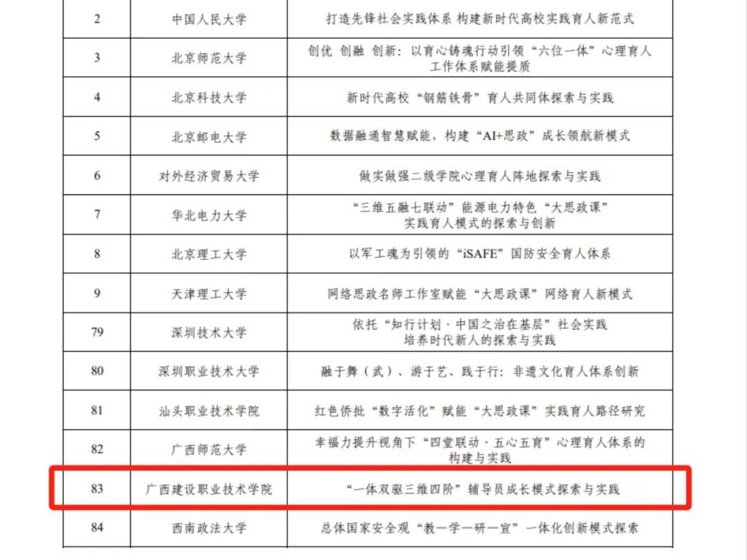 广西建院4月12日讯(管理工程组学院 郭海棠)近日,教育部公布2025年度高校思想政治工作质量提升综合改革与精品建设项目入选名单,sports申报的《“一体双驱三维四阶”辅导员成长模式探索与实践》入选2025年度高校思想政治工作精品项目,这是sports首次立项教育部思政精品项目,实现了在该项目上的新突破,是广西唯一入选的高职高专。教育部立项文件截图本次入选的精品项目由党委学生工作部统筹,在教育部2024年度高校思想政治工作质量提升综合改革与精品建设项目高校辅导员名师工作室海棠工作室的基础上申报。...