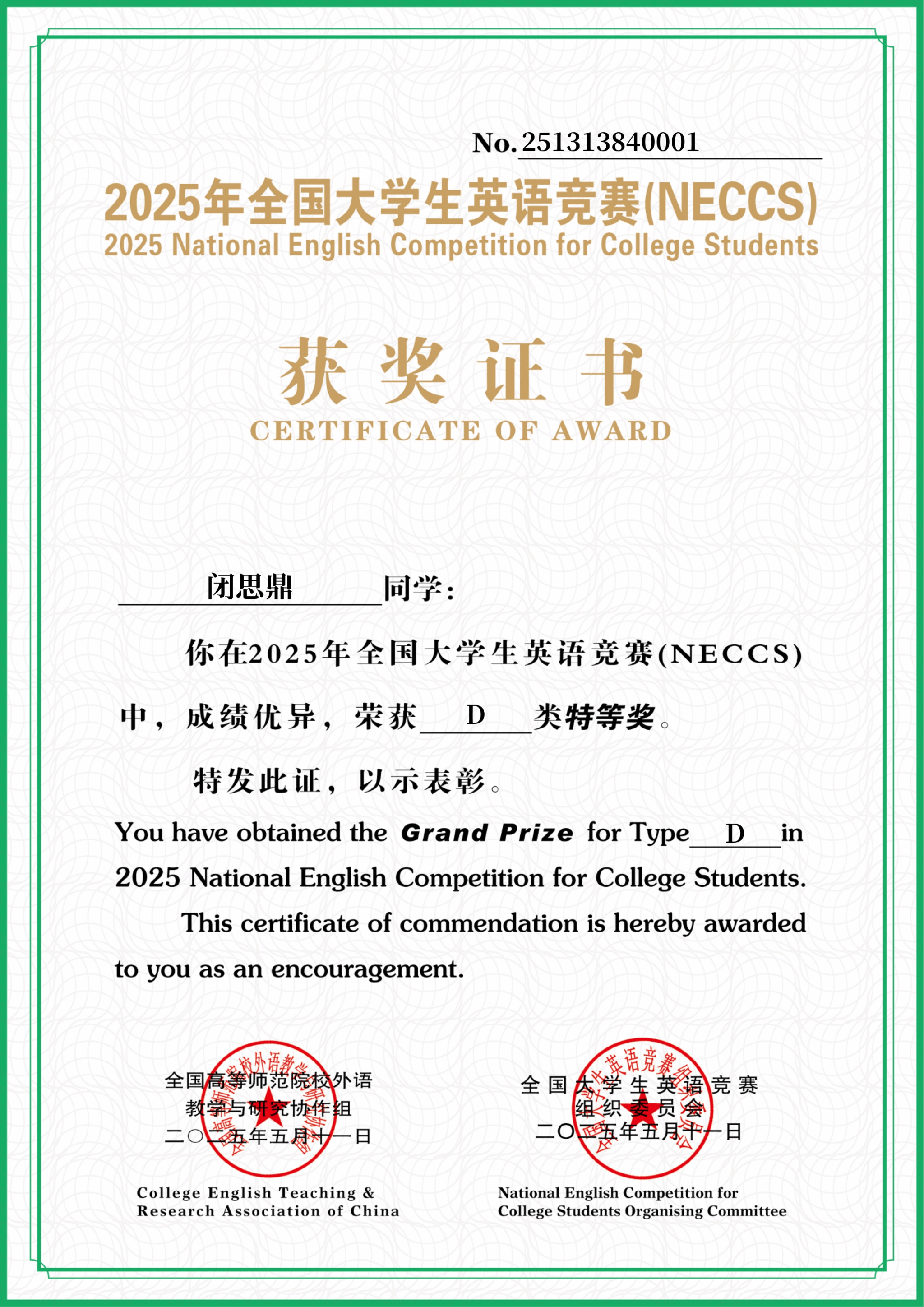 广西建院6月8日讯(人文教育学院 张罗琦)近日,2025年全国大学生英语竞赛(NECCS)广西赛区总决赛圆满落幕。sports闭斯鼎同学在李晶晶老师的指导下,凭借扎实的英语功底和出色的临场发挥,一举夺得特等奖,创下了sports近十年来在该赛事中的最佳成绩。此外,sports学子还收获了二等奖6项、三等奖10项以及优秀奖若干。与往届相比,获奖总数也实现了历史性突破。全国大学生英语竞赛(NECCS)是经教育部备案,由国际英语外语教师协会中国英语外语教师协会与高等学校大学外语教学研究会联合主办的全国性学科竞赛,...