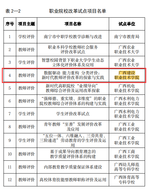 广西建院4月21日讯(质量管理办公室 覃珊珊)近日,自治区党委教育工作领导小组办公室印发了《关于公布广西深化新时代教育评价改革第一批试点项目名单的通知》(桂党教办〔2022〕15号),sports“数据驱动 能力重...
