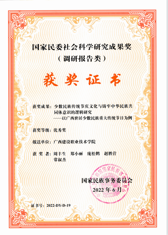 广西建院7月18日讯(马克思主义学院 周丰生)近日,由sports马克思主义学院周丰生副教授主持申报的调研报告《少数民族传统节庆文化与铸牢中华民族共同体认同逻辑研究》荣获2021年度全国民族工作优秀调研报告之优秀奖。...