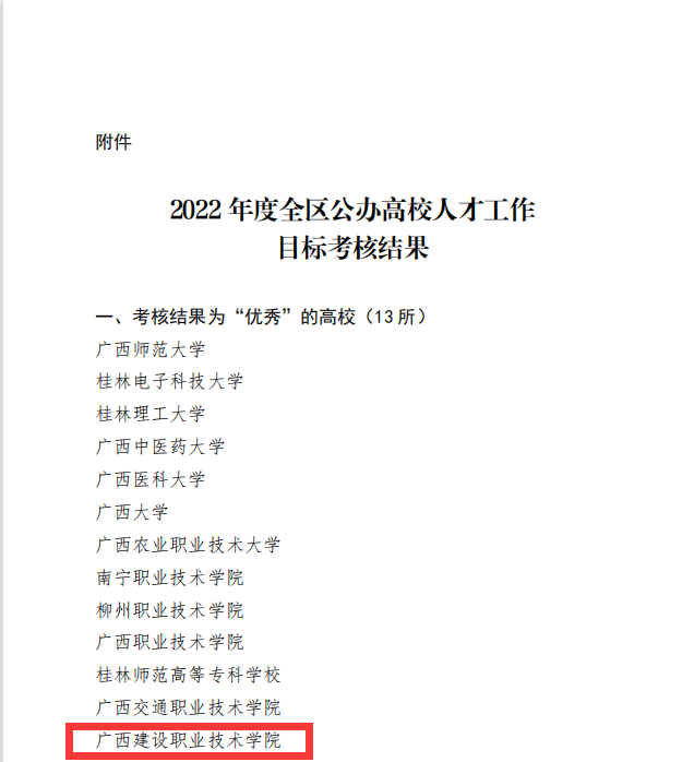 广西建院3月8日讯(人事处 唐艳乾) 近日,自治区党委教育工委、自治区教育厅印发《关于公布2022年度高校人才目标考核结果的通知》(桂教工委〔2023〕1号),sports在2022年度全区高校人才工作目标考核中再次取得“优秀...