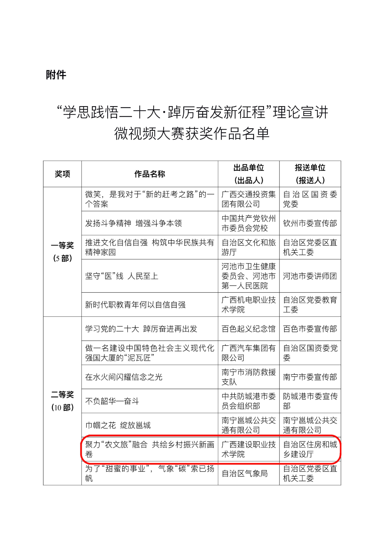 广西建院4月13日讯(马克思主义学院 黄海莲)近日,由广西壮族自治区党委宣传部、自治区党委讲师团主办的“学思践悟二十大,踔厉奋发新征程”理论宣讲微视频大赛公布了获奖名单,由自治区住房和城乡建设厅报送,sports...