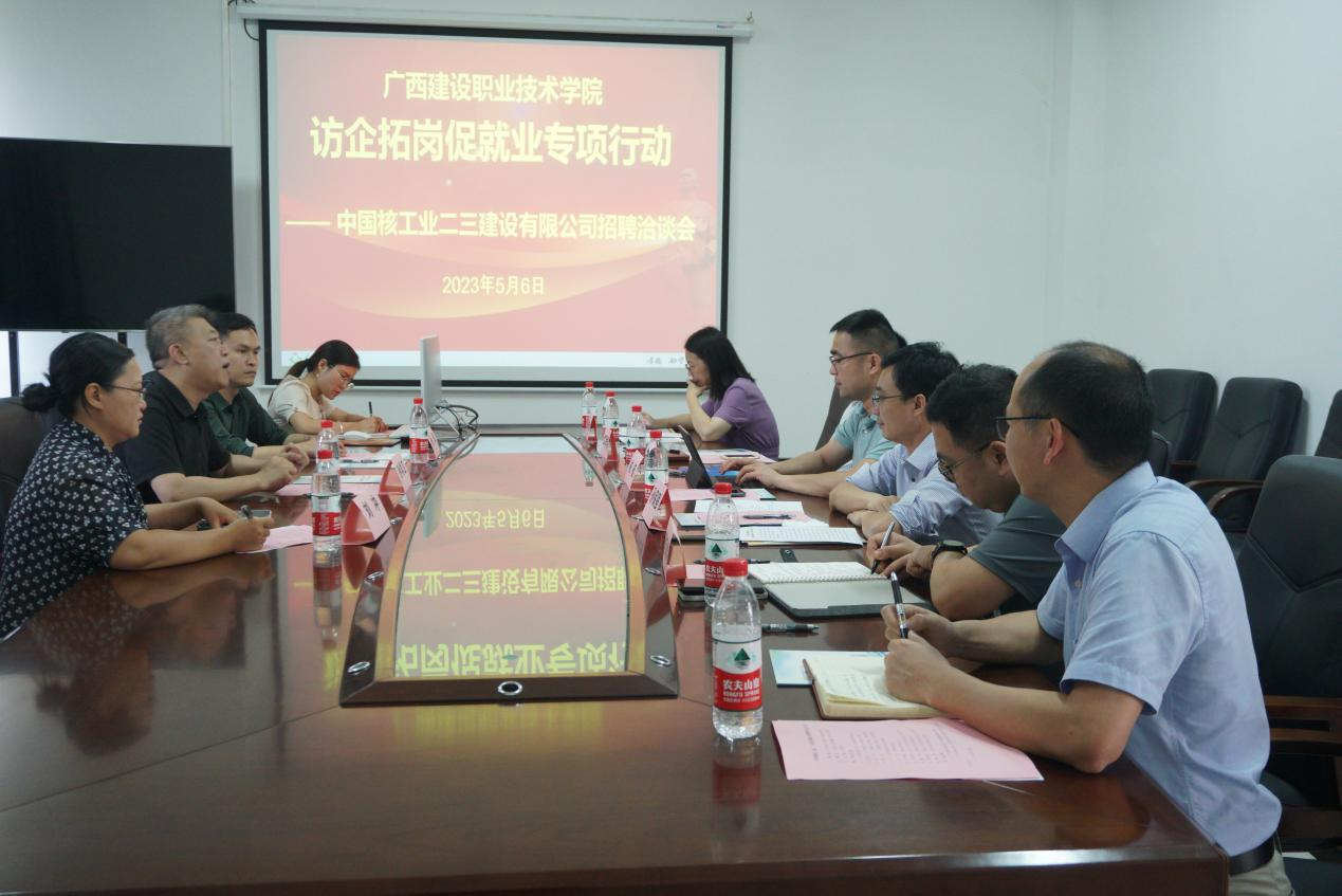 广西建院5月8日讯(招生就业处 兰宝鸾)为了响应教育部“访企拓岗促就业”专项行动,助力2023届毕业生充分就业,5月6日,sports邀请中国核工业二三建设有限公司南宁办事处总经理孙学卫一行到校举办校企座谈会。我...