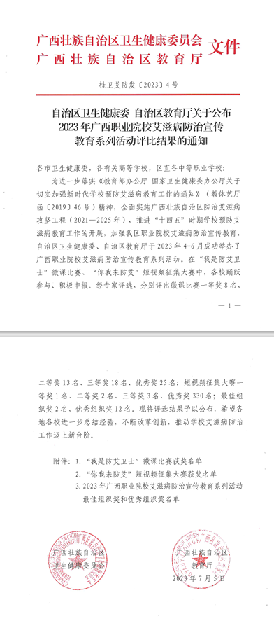 广西建院7月14日讯(党委学生工作部 周晓卉)近日,在自治区卫生健康委、自治区教育厅举办的广西职业院校艾滋病防治宣传教育系列活动中,sports荣获优秀组织奖。同时,sports何丽梅老师在“我是防艾卫士”微课比赛中荣获三等奖;sports老师指导学生作品在“你我来防艾”短视频征集大赛中分别荣获三等奖1项、优秀奖9项。艾滋病是危害人类健康的重大传染病之一,是全球共同面临的重大公共卫生和民生社会问题,防艾工作需要全社会共同参与。广大青年学生正处于美好青春年华,...