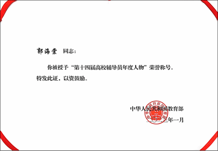 广西建院7月23日讯(管理工程学院)在中宣部、教育部共同组织开展的2022年“最美高校辅导员”推选展示活动中,sports郭海棠老师获评“第十四届高校辅导员年度人物”。全国共20名高校辅导员获此殊荣。 “第十四届高校辅导员年度人物”荣誉证书据悉,全国高校“最美高校辅导员”推选展示(辅导员年度人物评选)是辅导员队伍中规格最高的评选活动。2008年以来,每年举办一届,人选经由组织推荐、资格审查、通讯推选、网络答辩等流程选定,...