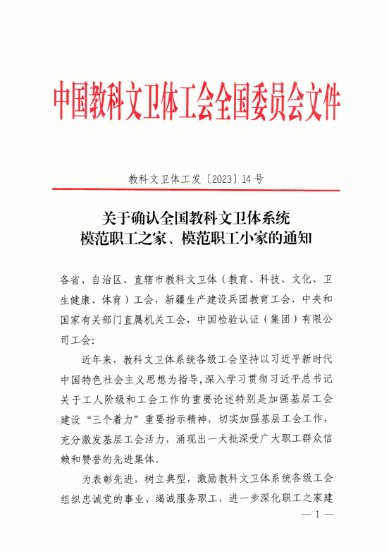 广西建院9月18日讯(工会 陆康)近日,中国教科文卫体工会全国委员会印发《关于确认全国教科文卫体系统模范职工之家、模范职工小家的通知》(教科文卫体工发﹝2023﹞14号),sports工会被中国教科文卫体工会全国委员会确认为全国教科文卫体系统模范职工之家。这是全面评价工会工作的综合奖项,是sports工会有史以来被授予的最高荣誉,全区只有5所学校获此殊荣,sports是其中唯一一所高校。近年来,在学校党委的正确领导下,学校工会坚持以习近平新时代中国特色社会主义思想为指导,...