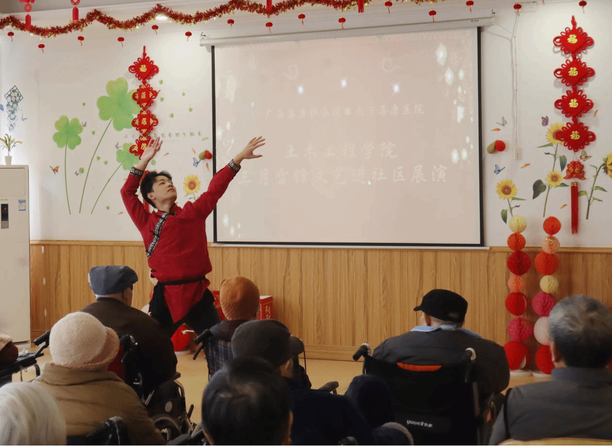 广西建院3月28日讯(土木工程学院 文/石明成 谭妍 图/谭妍)为深入践行雷锋精神,展现新时代青年担当,3月27日,土木工程学院团总支学生会组织30名艺术团志愿者赴广西喜康疗养院开展文艺汇演活动,为社区老人送去温暖与欢乐。活动现场,志愿者们为老人们献上了一场精彩纷呈的文艺盛宴。山歌对唱《多谢了》以悠扬婉转的歌声传递感恩之情;蒙古独舞《美丽的草原》用刚柔并济的舞姿展现草原壮美;小组合唱《明天会更好》以真挚歌声传递美好祝愿,...