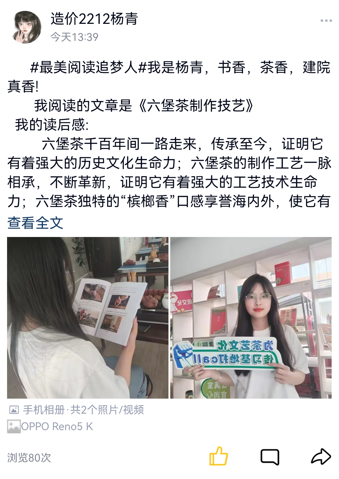 广西建院4月9日讯(管理工程学院 郭海棠莫倩芳)由管理工程学院主办、海棠工作室和茶艺文化传习基地承办的第六届“最美阅读追梦人”阅读分享活动于今年3、4月面向全校师生开展。活动以“遇见一杯广西茶”为主题,以海...